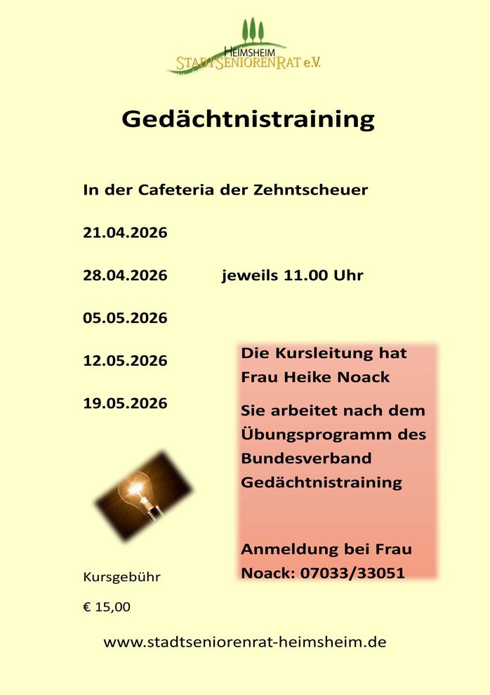 Die Kursleitung hat Frau Heike Noack. Sie arbeitet nach dem Übungsprogramm des Bundesverbandes Gedächtnistraining.