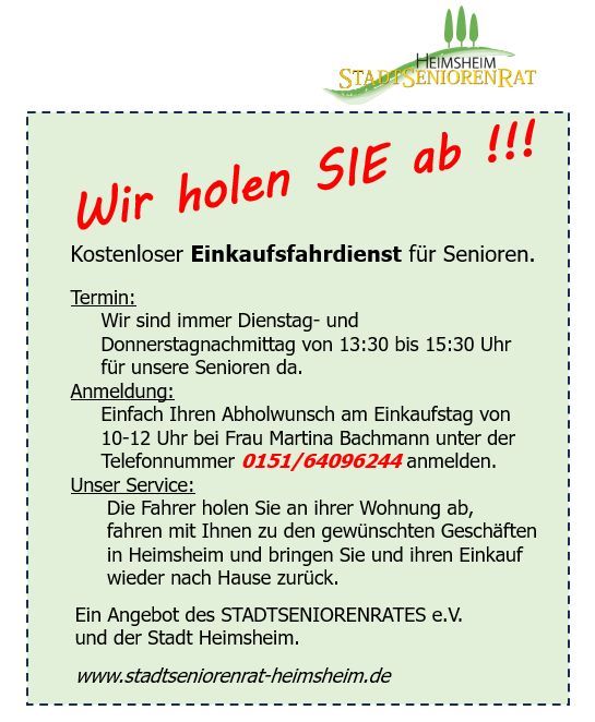 - bietet einen freiwilligen Mitfahrdienst für Einkäufe und Besorgungen in Heimsheim an