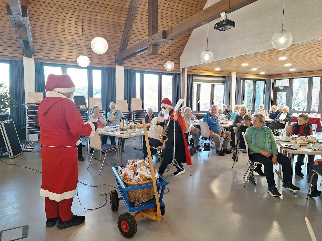 Andacht gehalten, die Zithergruppe aus Calw - Stammheim hat weihnachtliche Lieder für uns gespielt, die Zirkus-AG sowie der Mädchenchor der LUS hatten ein kurzweiliges Programm für uns zusammengestellt. Der Nikolaus kam mit seinem Helfer, der uns auf seinem Saxophon vorspielte, und stellte ihn als seinen Nachfolger vor. Er hatte einen Wagen voller Geschenke dabei.