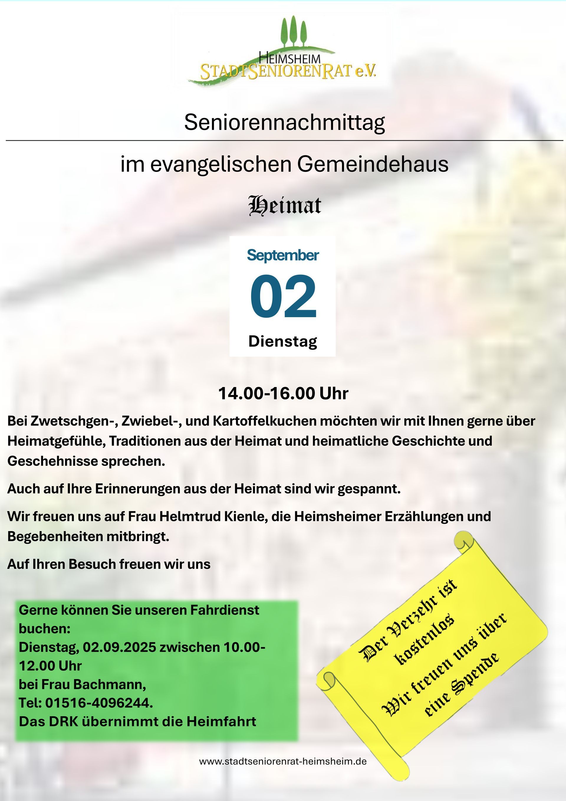 Der nächste Seniorennachmittag findet am Dienstag, 02.09.2025 statt